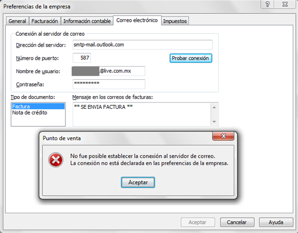 En los últimos últimos días al tratar de enviar por correo un Comprobante Fiscal Digital manda el siguiente mensaje: "No fue posible establecer la conexión al servidor de correo. La conexión no está declarada en las preferencias de la empresa."